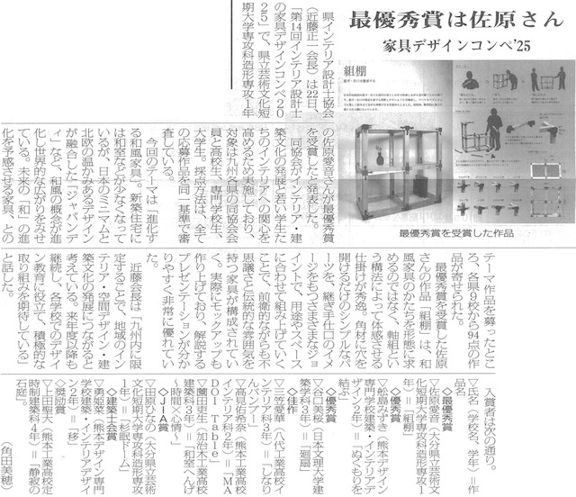 【家具デザインコンペ】 2026年2月12日の大分建設新聞に掲載されました。(新聞記事[PDFファイル]) 2025年12月26日の大分建設新聞に掲載されました。 (コンペ情報の目次に戻る)